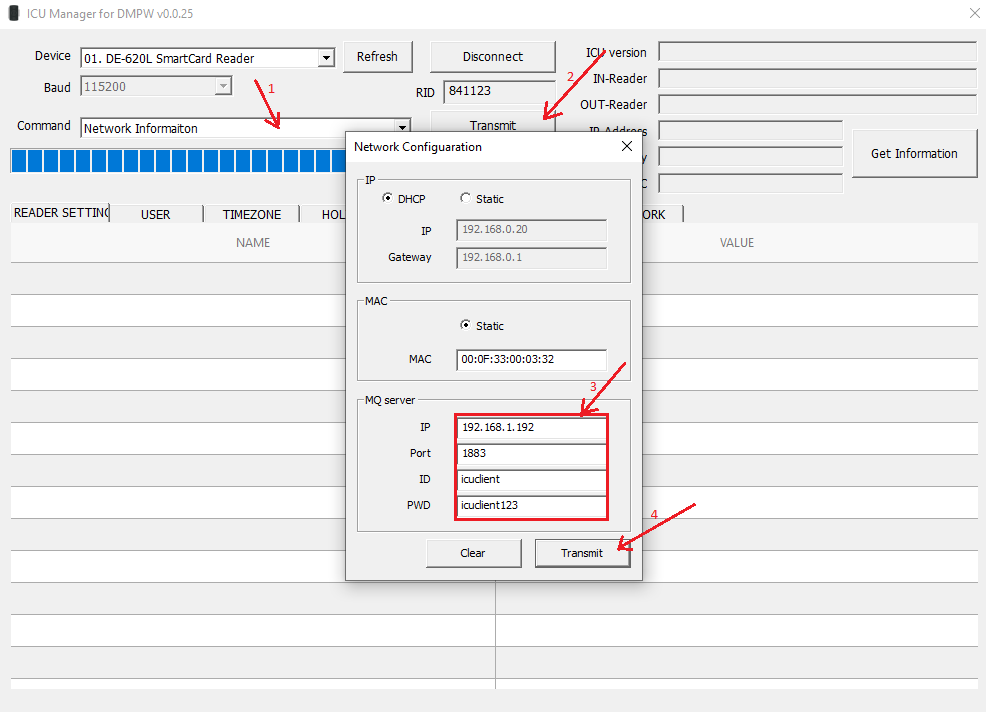 Step 4: Config network device to your IP. Select Command 'Network Information' then click 'Transmit'. It will show Modal config, in this modal enter your information of your IP, port, (ID, PWD) is account of mqtt. After update information config click 'Transmit' to save config.